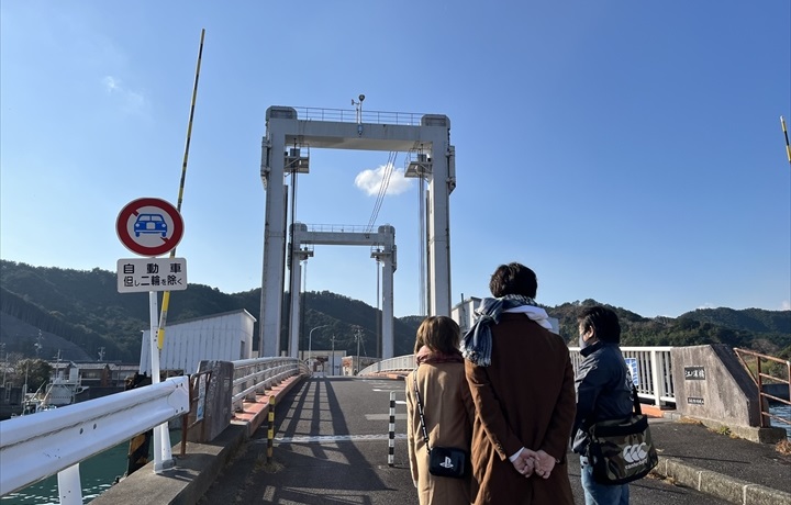 魚まちは、船が優先。橋が上がると歩行者や2輪車は、遮断機の手前で船が通るのを待ちます。運がよければ、見れるかも。